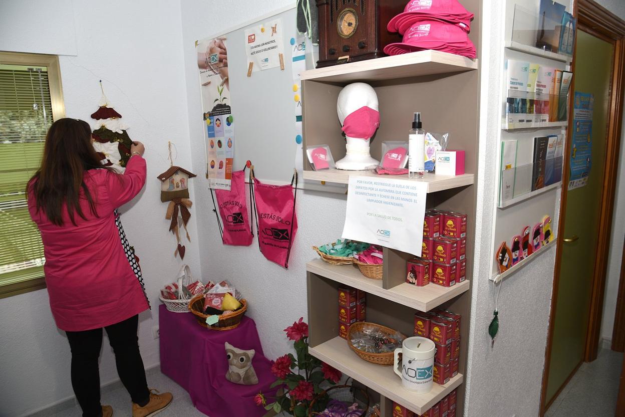 No ha podido ser en ningún local céntrico por las restricciones, pero la Asociación Oncológica Extremeña (AOEx) ha abierto también este año su tradicional mercadillo. «Muchas personas nos lo han reclamado, personas que están acostumbradas, y que quieren hacerlo para ayudarnos, a hacer sus compras navideñas en nuestro mercadillo y, por eso, finalmente hemos decidido abrirlo», explica Lourdes Palomo, delegada local de AOEx.