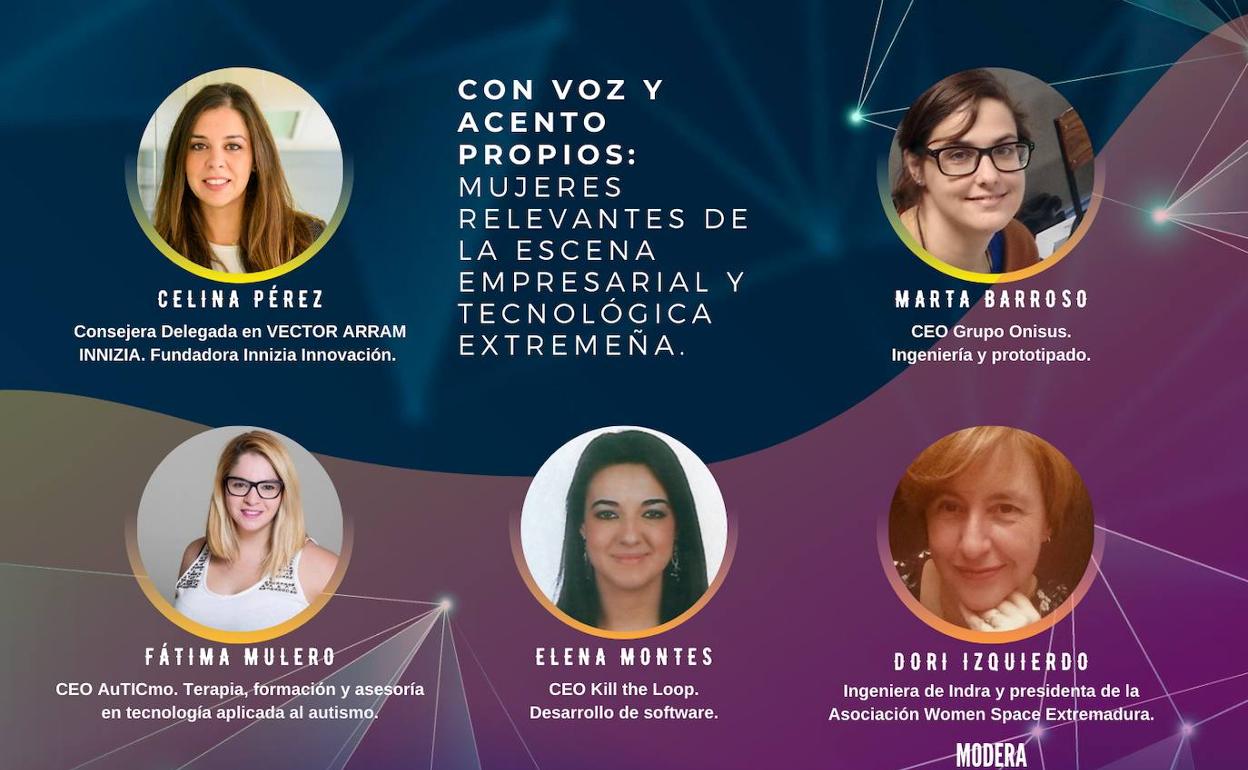 Estas cinco mujeres son Dori Izquierdo, que actuará como moderdora, y que es ingeniera de Indra y presidenta de la Asociación Women Space Extremadura; Celina Pérez, Consejera delegada en Vector Arram Innizia y fundadora de Innizia Innovación; Elena Montes, CEO de Kill the Loop; Marta Barroso, CEO de Grupo Onisus, y Fátima Mulero, CEO de AuTICmo. Todas ellas son referentes femeninas en proyectos de tecnología digital.