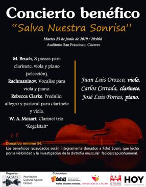 La Asociación Cultura Agustín Orozco organiza el martes 25 de junio a las 20.00 en el Auditorio San Francisco de Cáceres un concierto a ... beneficio de la asociación que combate la distrofia muscular facioescapulohumeral (FSHD).
