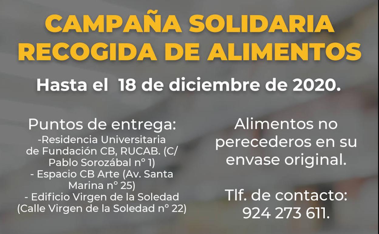 RUCAB y Fundación CB lanzaron el pasado mes la 'Primera Campaña Solidaria de Alimentos' para las personas y familias más necesitadas y vulnerables de Badajoz. Con el fin de agilizar y facilitar las donaciones, la residencia y Fundación CB han decidido ampliar los puntos de entrega de alimentos para esta campaña. Además de la Residencia Universitaria de Fundación CB, la Rucab (recoge alimentos de lunes a domingo de 8.00 a 23.00 horas); también se podrán entregar en el Espacio CB Arte (de lunes a viernes de 17.30 a 21.00 horas, y los sábados de 11:00 a 13:30 horas; y el edificio situado en la calle Virgen de la Soledad número 22 (de lunes a viernes de 18.00 a 21.00 horas)