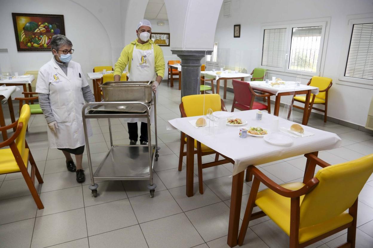 La comida se sirve a la una menos cuarto. La mejor hora para la conexión con las líneas de autobuses de Vectalia que pasan por la antigua Hostería. Se desinfectan las manos, comen y a la una y diez se van.