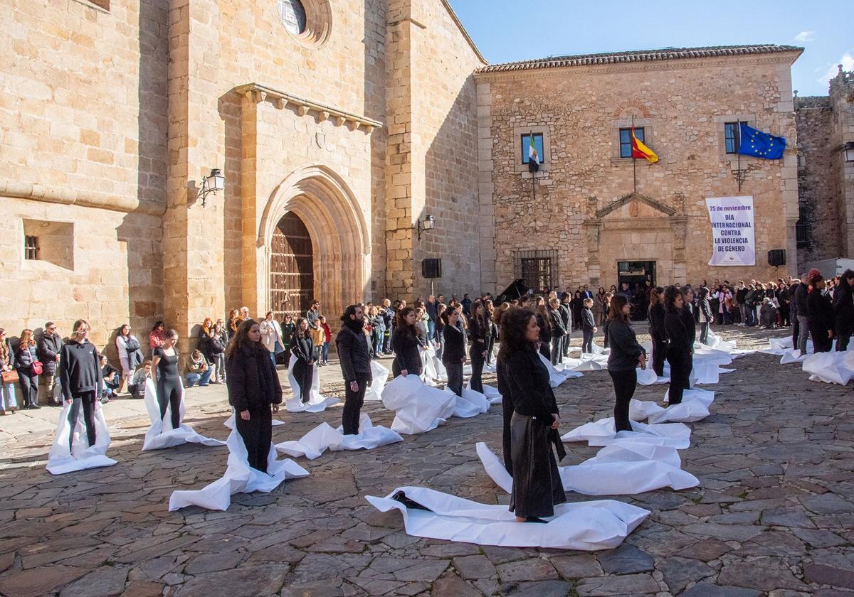 Tras este preámbulo, la técnica de Igualdad de la Diputación de Cáceres, Maite Telo, ha procedido a la lectura del Manifiesto Institucional, a lo que ha seguido la puesta en escena de la performance «El Silencio no Calla», en la que un grupo de personas voluntarias, coordinadas por Atakama Producciones y Teatro Maltravieso, han gritado los nombres, uno a uno, de las mujeres asesinadas en lo que va de año por su parejas o ex parejas y la edad en la que las mataron. El punto álgido de la actuación ha sido el momento en el que, como parte de la intervención, las actrices y actores se han encerrado en una bolsa mortuoria, dejando a la luz, de manera impactante, la magnitud del número de mujeres a las que la violencia machista les ha arrebatado la vida.