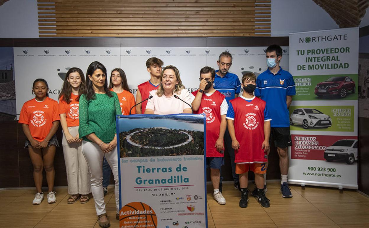 La diputada de Políticas Sociales, Igualdad, Participación y Atención a la Ciudadanía de la Diputación Provincial de Cáceres, Amelia Molero Fragoso, ha presentado este lunes el I Campus Inclusivo «Tierras de Granadilla», un proyecto que se enmarca dentro del programa Diputación Inclusiva y que tiene como principales fines la normalización de actuaciones no segregadas en el ocio y el deporte, la promoción de valores de inclusión y de una imagen positiva de las personas con discapacidad intelectual, así como la no discriminación por razón de discapacidad o sexo. A esta presentación también han asistido la vicepresidenta de Down Cáceres, Lourdes García; el entrenador en el club de baloncesto Sagrado Corazón, Juan Carlos Marquez, y niñas y niños del equipo de baloncesto inclusivo del citado club.