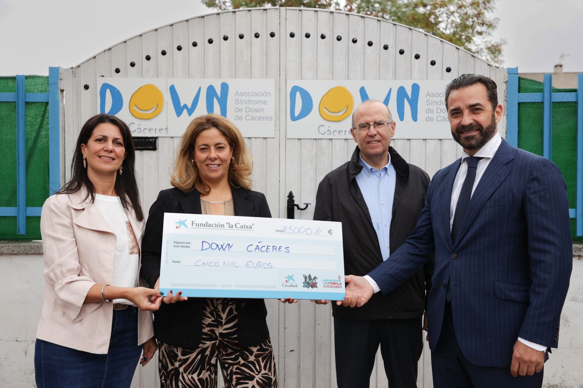 Al acto de entrega del cheque, que ha tenido lugar en la sede de Down Cáceres, han asistido el presidente de Down Cáceres, José Felipe Arroba; su vicepresidenta, Lourdes García; la directora del Área de Negocio de CaixaBank en Cáceres, Marian Tello, y el director comercial de Red de CaixaBank en Extremadura, César Corcho.