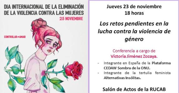 Analizar el fenómeno de la violencia de género con una visión de futuro, para identificar los retos pendientes en la lucha por su erradicación, es el objetivo de la conferencia que pronunciará Victoria Jiménez Zozaya, integrante en España de la plataforma CEDAW Sombra de la ONU.