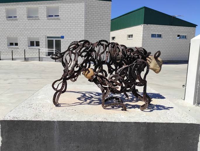 Ejemplo de ello es la escultura que representa una oveja amamantando a su cría, elaborado con herraduras y piedra de la zona, ubicada en una gran peana de hormigón. Se trata de un encargo de Inexcon Obras y Servicios para EA Group, Sociedad Cooperativa, más conocido como Copreca, y que se puede ver ya en una de sus entradas.
