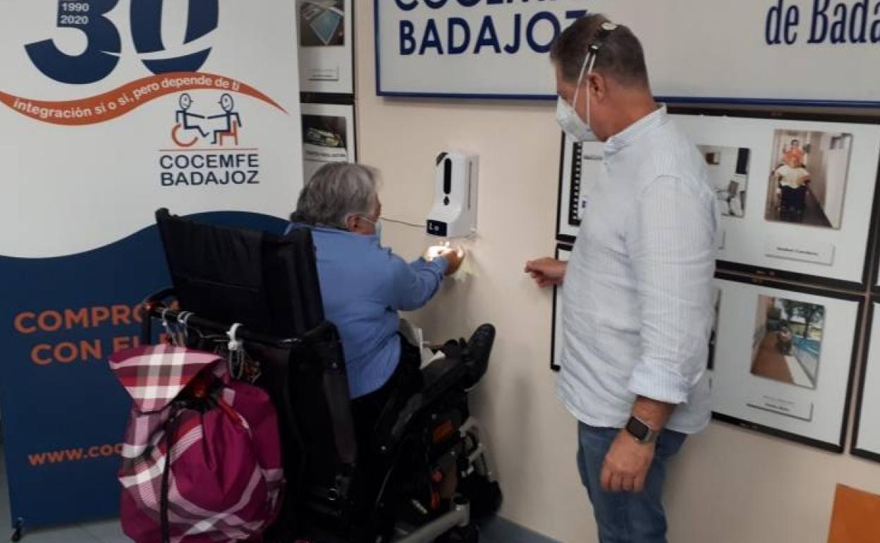 La empresa pacense Maktub Digital ha donado a Cocemfe Badajoz un lector accesible de temperatura, que es además dispensador electrónico de gel desinfectante. Como se puede observar en la imagen, este dispositivo está colocado a la altura adecuada para que pueda ser utilizado por personas en sillas de ruedas.