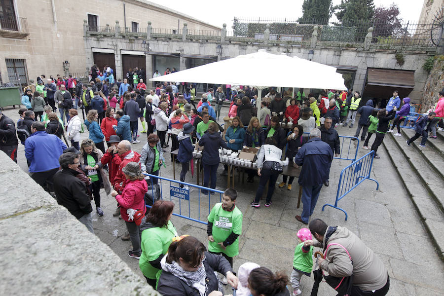 La jornada comenzó con un desayuno gratuito que brindó la Fundación Mercedes Calles en la Plaza de San Jorge. A las 10 de la mañana salieron los corredores y a las 10,15 las personas dispuestas a hacer el recorrido de una forma más relajada. Los paraguas y los chubasqueros no faltaron a lo largo del recorrido, que terminó en el pabellón Multiusos, donde muchos de los participantes pudieron acceder de manera gratuita a ver el partido de baloncesto del Cáceres contra el Araberri vitoriano. La cancha lució un espectacular ambiente plagado de las camisetas verdes conmemorativas de esta cita.