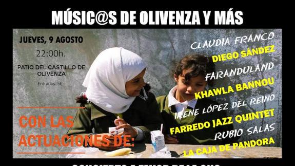 La contribución que desde Olivenza se hizo a este proyecto se recaudó gracias al precio de cinco euros por entrada establecido para disfrutar de las actuaciones de artistas locales como Claudia Franco, Diego Sández, Faranduland, Irene López del Reino, Farredo Jazz Quintet, Rubio Salas, Khawla Bannou y La Caja de Pandora.