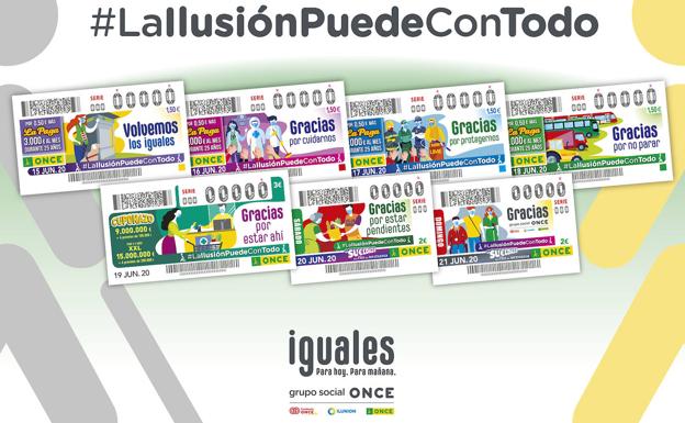 El primer cupón, perteneciente al lunes, 15 de junio, está dedicado a la vuelta de los vendedores y vendedoras de la ONCE a las calles de pueblos y ciudades para continuar llevando la ilusión a todos los rincones, y se titular 'Volvemos... Los iguales', en referencia a la denominación histórica de los cupones de la organización y a su aspiración de lograr una sociedad de iguales, sobre todo en derechos y oportunidades, para las personas ciegas o con discapacidad.