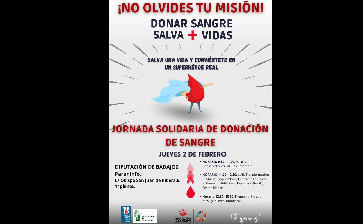 El Paraninfo del Palacio Provincial de la Diputación de Badajoz albergará el próximo 2 de febrero una jornada de donación de sangre dirigida a trabajadores de la institución y a la ciudadanía en general que deseen colaborar en esta campaña 2023.