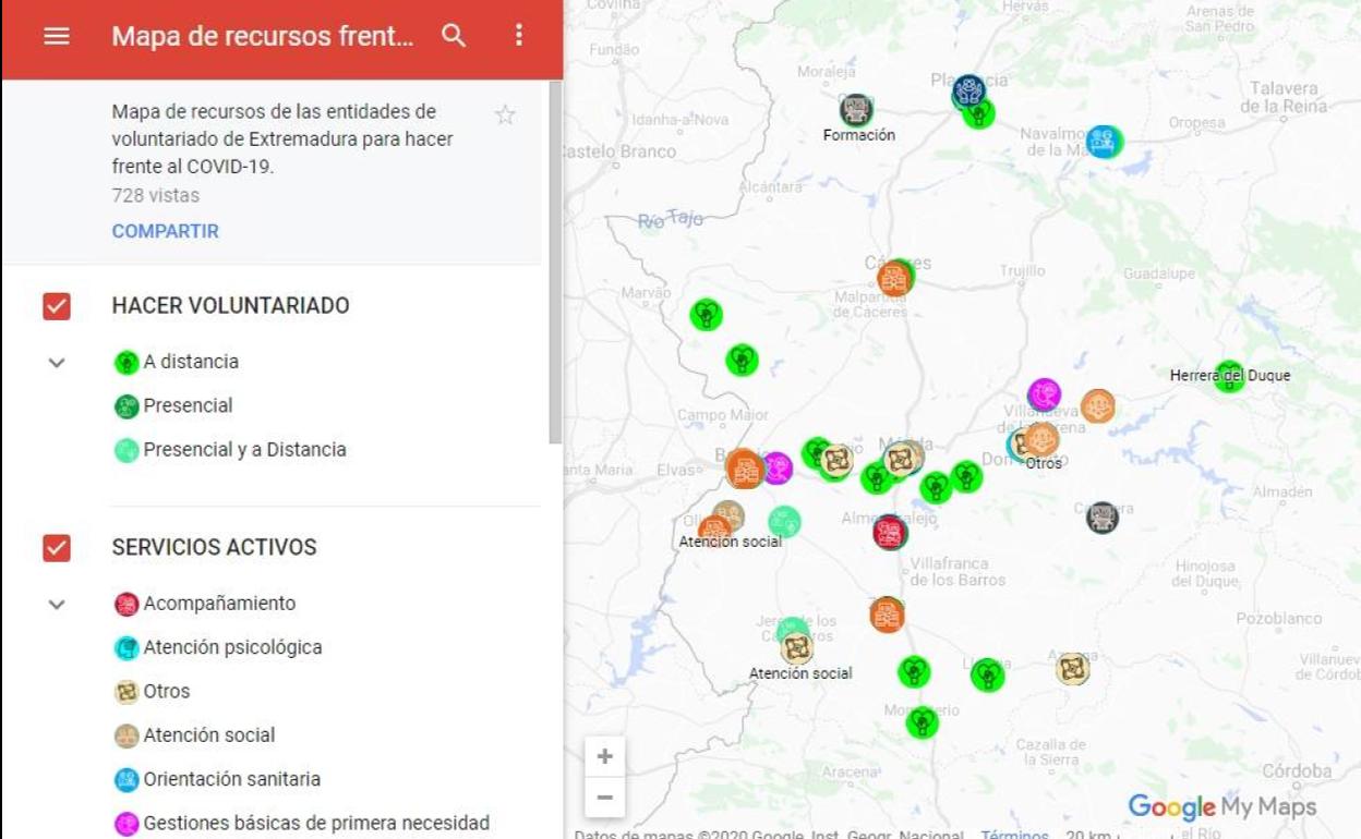 La Plataforma del Voluntariado de Extremadura, consciente de la necesidad de aunar esfuerzos, ha puesto en marcha una acción destinada a coordinar los recursos y necesidades de sus entidades miembros, con la colaboración de la Dirección General de Servicios Sociales, Infancia y Familias, de la Consejería de Sanidad y Servicios Sociales de la Junta de Extremadura. Consiste en un mapa de Extremadura de recursos para hacer frente a la covid-19, en el que se muestran las ofertas de voluntariado, las demandas de colaboración y los servicios activos que nuestras entidades miembro ponen a disposición de la ciudadanía, no sólo mientras dure la crisis sanitaria sino con el fin de que perdure en el tiempo y sea una herramienta útil para mostrar los recursos y las necesidades en un espacio común.