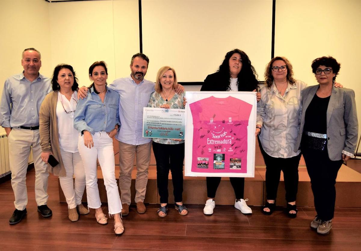La diputada delegada de Igualdad, Juventud y residencia Universitaria Hernán Cortés, Cristina Valades, acompañada de la directora del Área, Emilia Parejo, y el director del centro, Joaquin Pineda, en nombre de los residentes, ha hecho entrega a la Asociación Oncológica Extremeña de un cheque con el importe de lo recaudado en la III Marcha Solidaria 'Ayúdanos a repartir sonrisas por toda Extremadura', que se celebró el pasado 15 de abril en Badajoz.